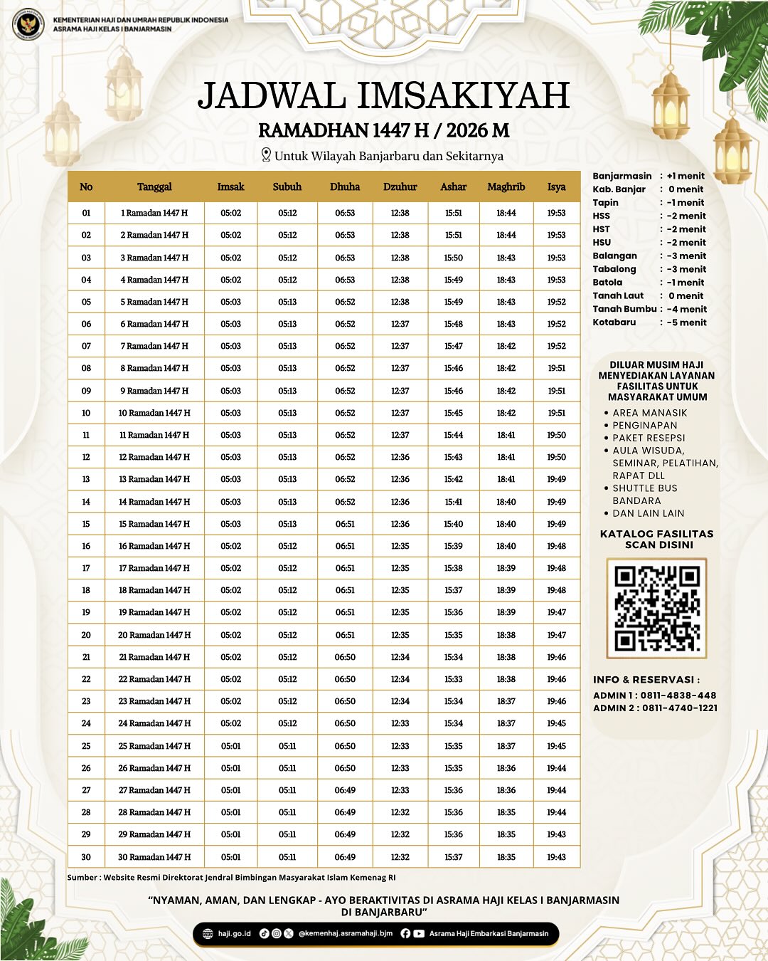 Selain memuat jadwal imsakiyah, informasi ini juga disertai layanan fasilitas yang tersedia di Asrama Haji Embarkasi Banjarmasin. Di luar musim haji, asrama tersebut membuka layanan untuk masyarakat umum seperti area manasik, penginapan, paket resepsi, aula wisuda, seminar, pelatihan, hingga shuttle bus bandara.