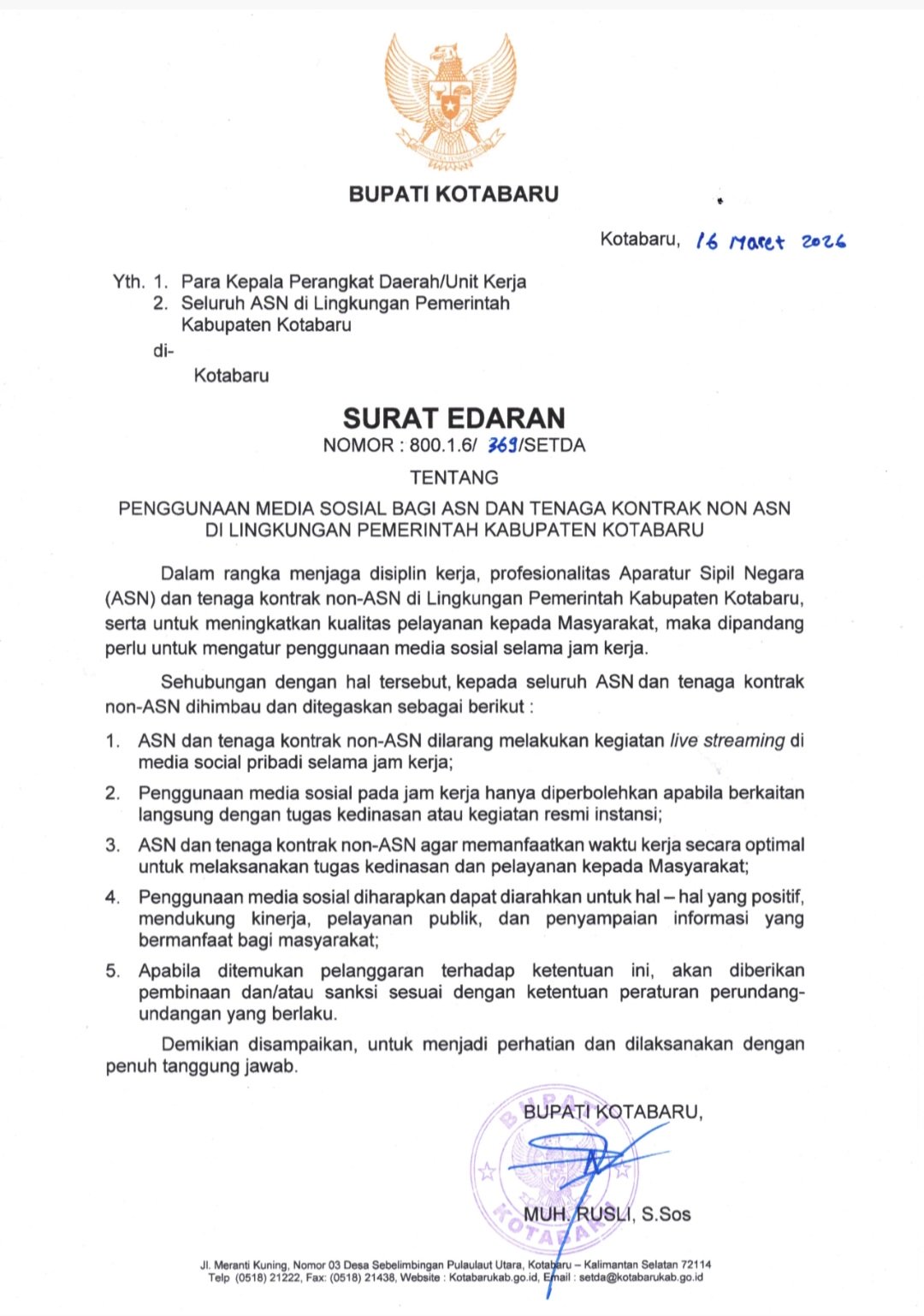 Surat edaran tersebut ditandatangani Bupati Kotabaru, H Muhammad Rusli, pada 16 Maret 2026. Aturan ini diterbitkan untuk memperkuat disiplin kerja sekaligus meningkatkan profesionalitas aparatur dalam memberikan pelayanan kepada masyarakat.