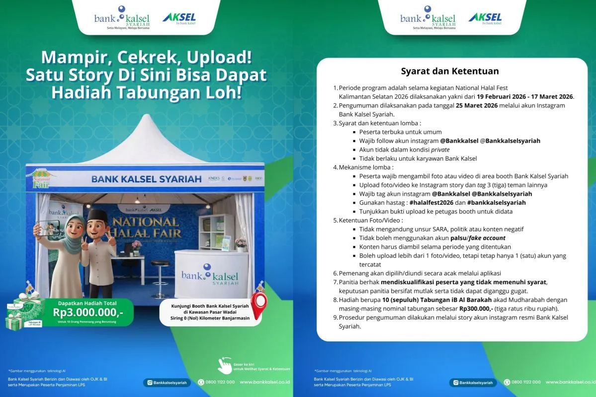 “Peserta diwajibkan sudah mengikuti (follow) akun Instagram resmi Bank Kalsel dan Bank Kalsel Syariah,” terang Manajemen Bank Kalsel.