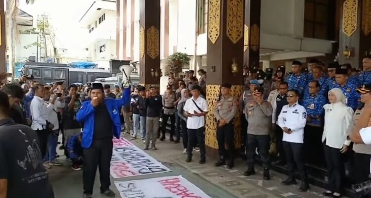 BANJARUPDATE.COM, BANJARMASIN – Puluhan mahasiswa Aliansi Rakyat menggelar aksi di Balai Kota